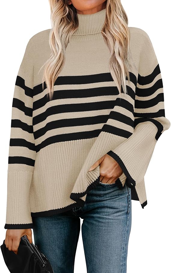 - Looking for a warm turtleneck sweater this fall and winter season? Our long sleeve striped sweater is the ideal choice for you, featuring a highneck, flared sleeves, ribbed cuffs/hem, side slit, and a simple yet classic stripe. The relaxed fit is perfect for almost any body type!